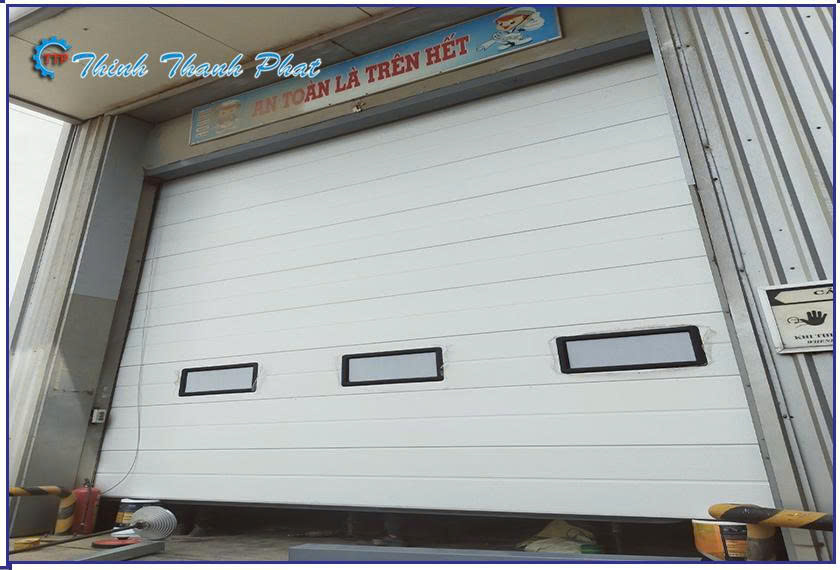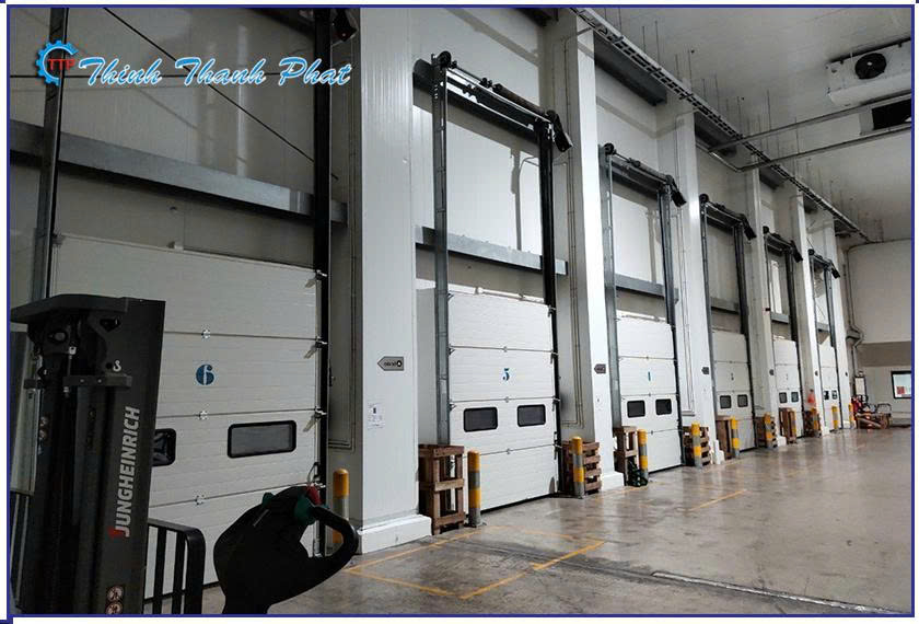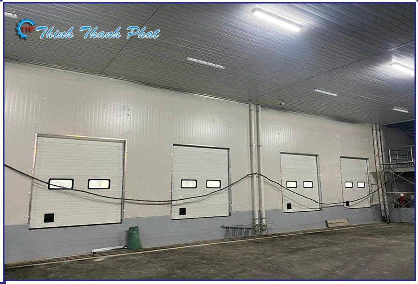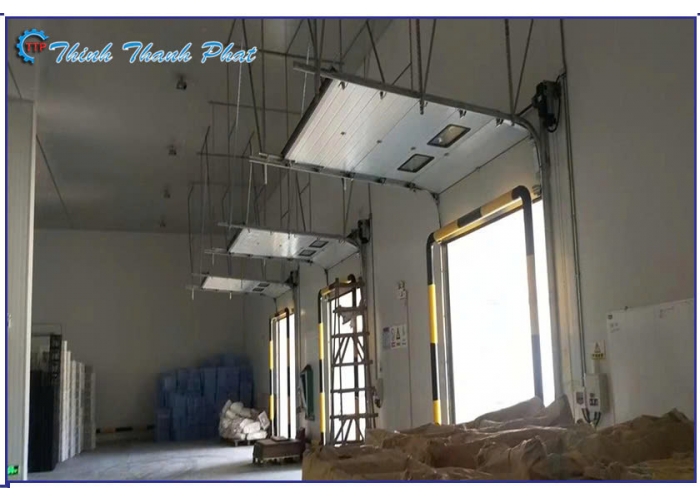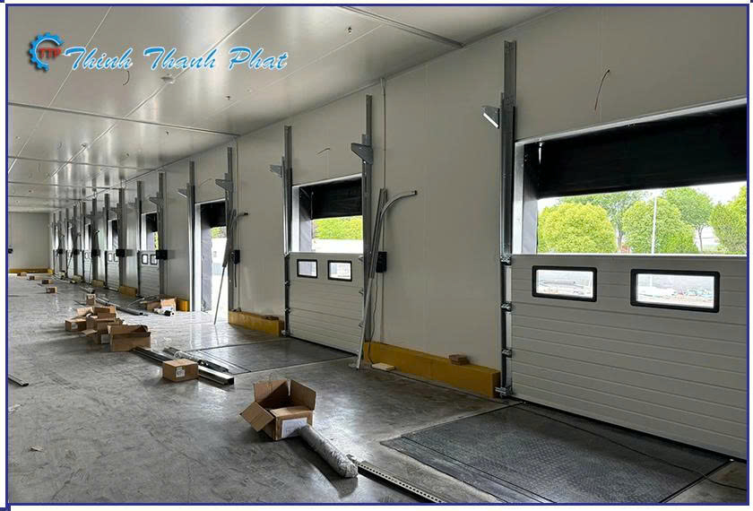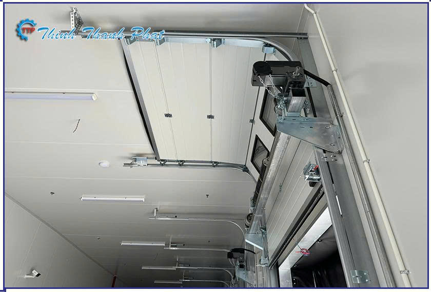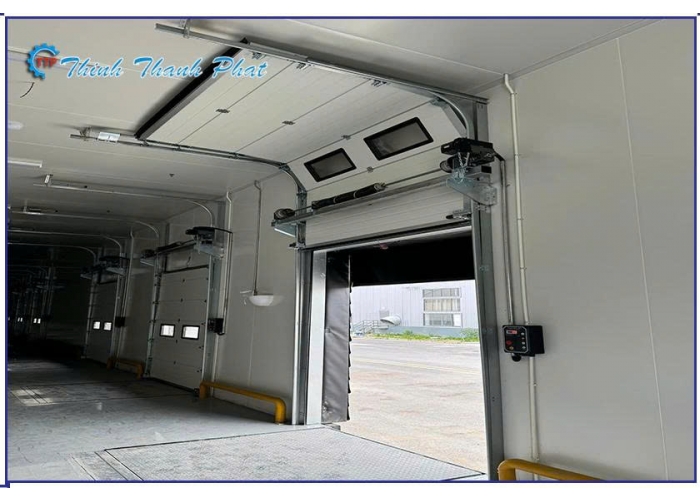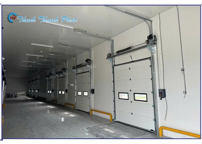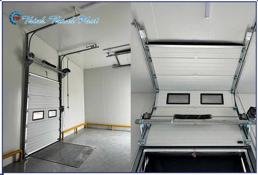 Tiết kiệm không gian: Cơ chế trượt lên trần giúp cửa không chiếm diện tích mặt sàn hoặc không gian mở cửa phía trước/sau, rất lý tưởng cho khu vực có lối đi hẹp hoặc cần vận chuyển hàng hóa lớn.